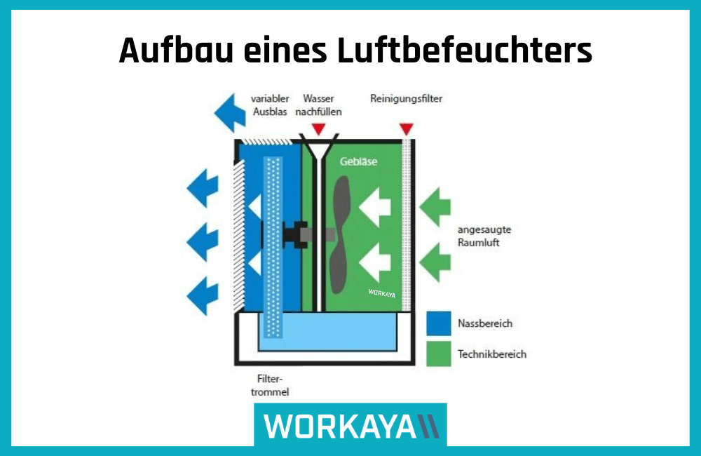 Verdunstung: Wasser wird über Filter oder Matten verteilt und in die Raumluft abgegeben.